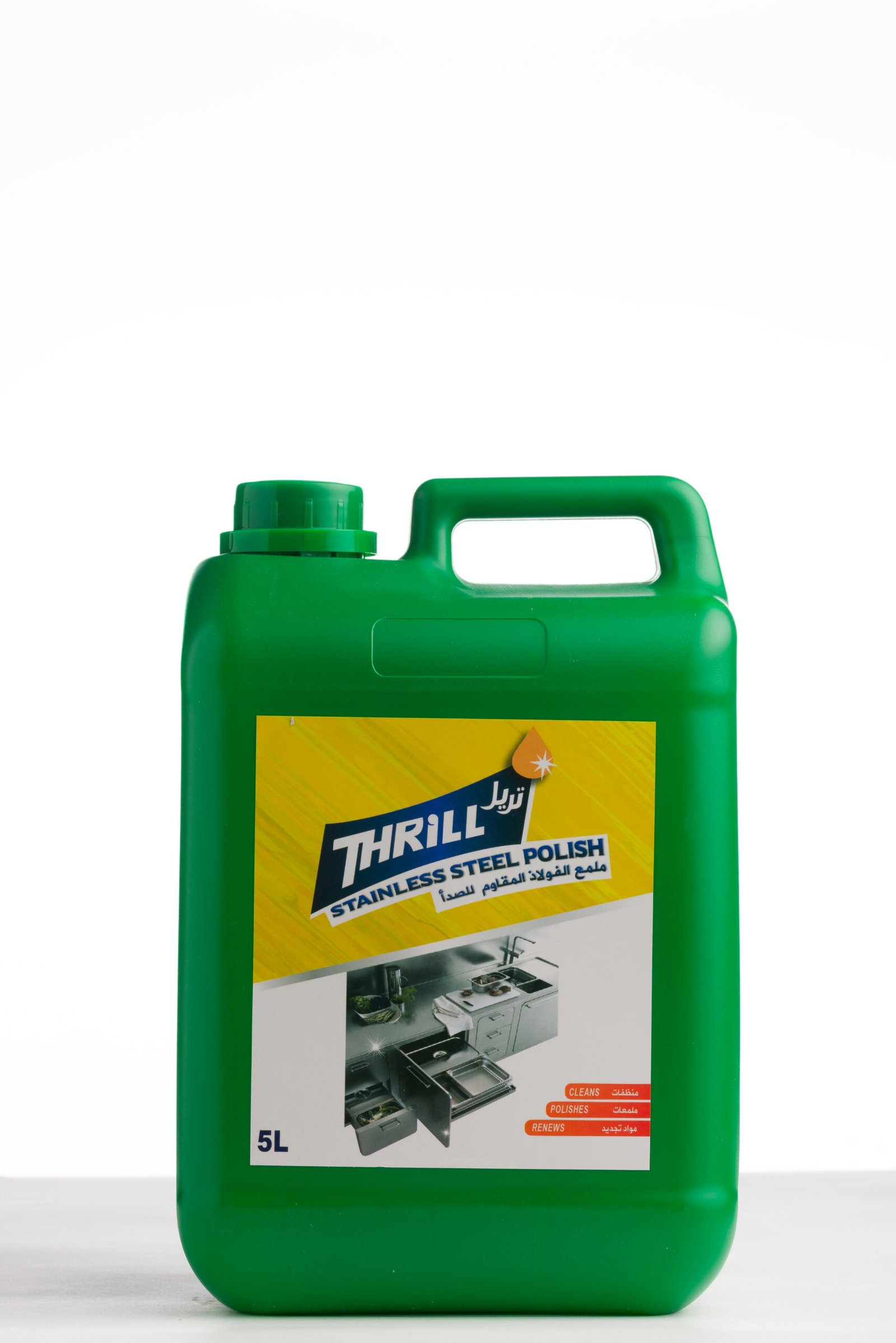 THRILL Stainless Steel Polish, from Deluxe Chemical Qatar, shines metal surfaces to a mirror finish. Its premium polishing agents restore brightness and remove fingerprints, stains, and oxidation from stainless steel, chrome, and aluminium surfaces.