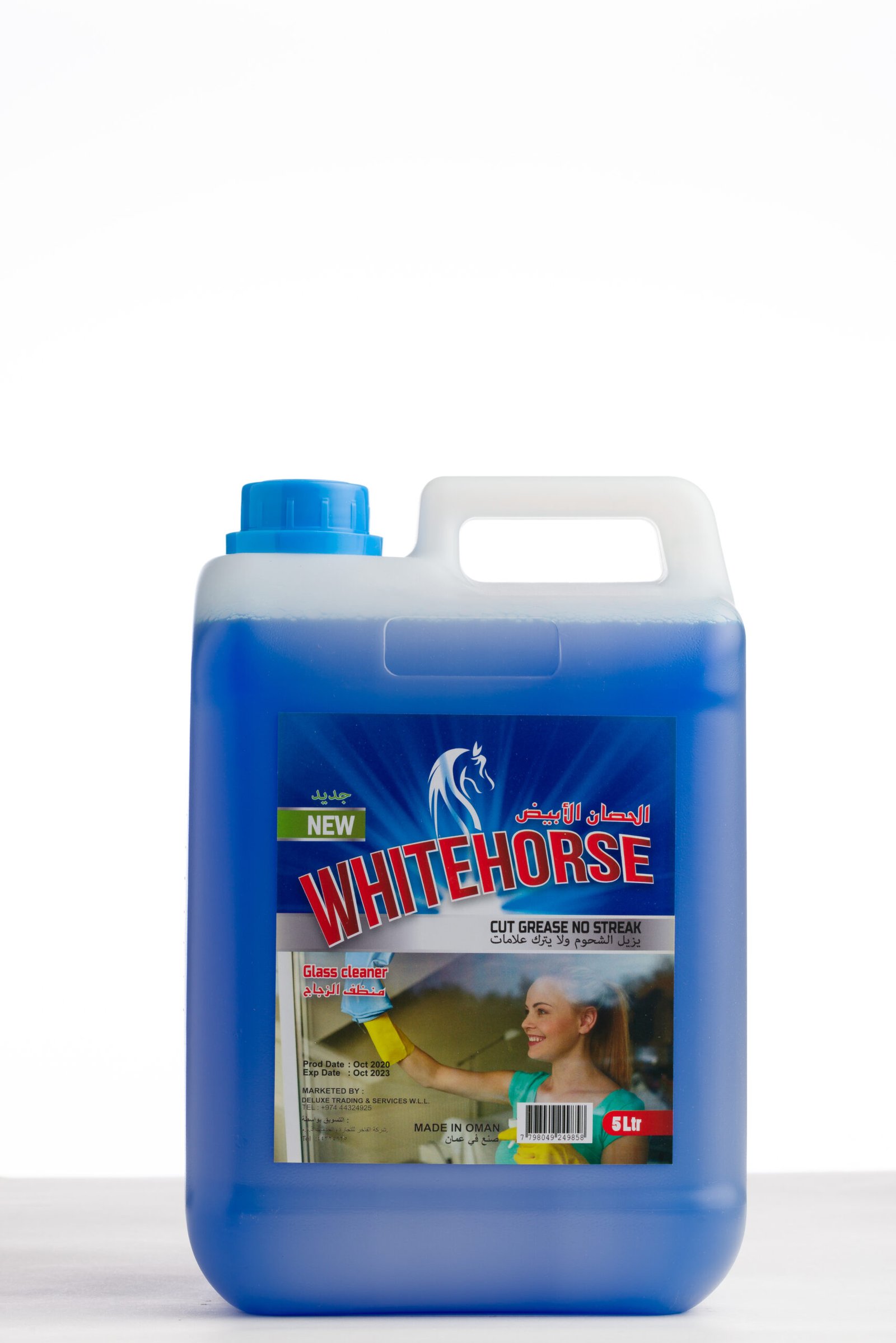 Buy WHITE HORSE Glass Cleaner (5 LTR) from Deluxe Chemical Qatar — commercial-strength cleaner for streak-free, brilliant glass surfaces.